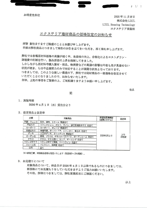 このあと、LIXILに続いてYKKAP,三協立山などが値上げの発表をしてくるものと思われます。
