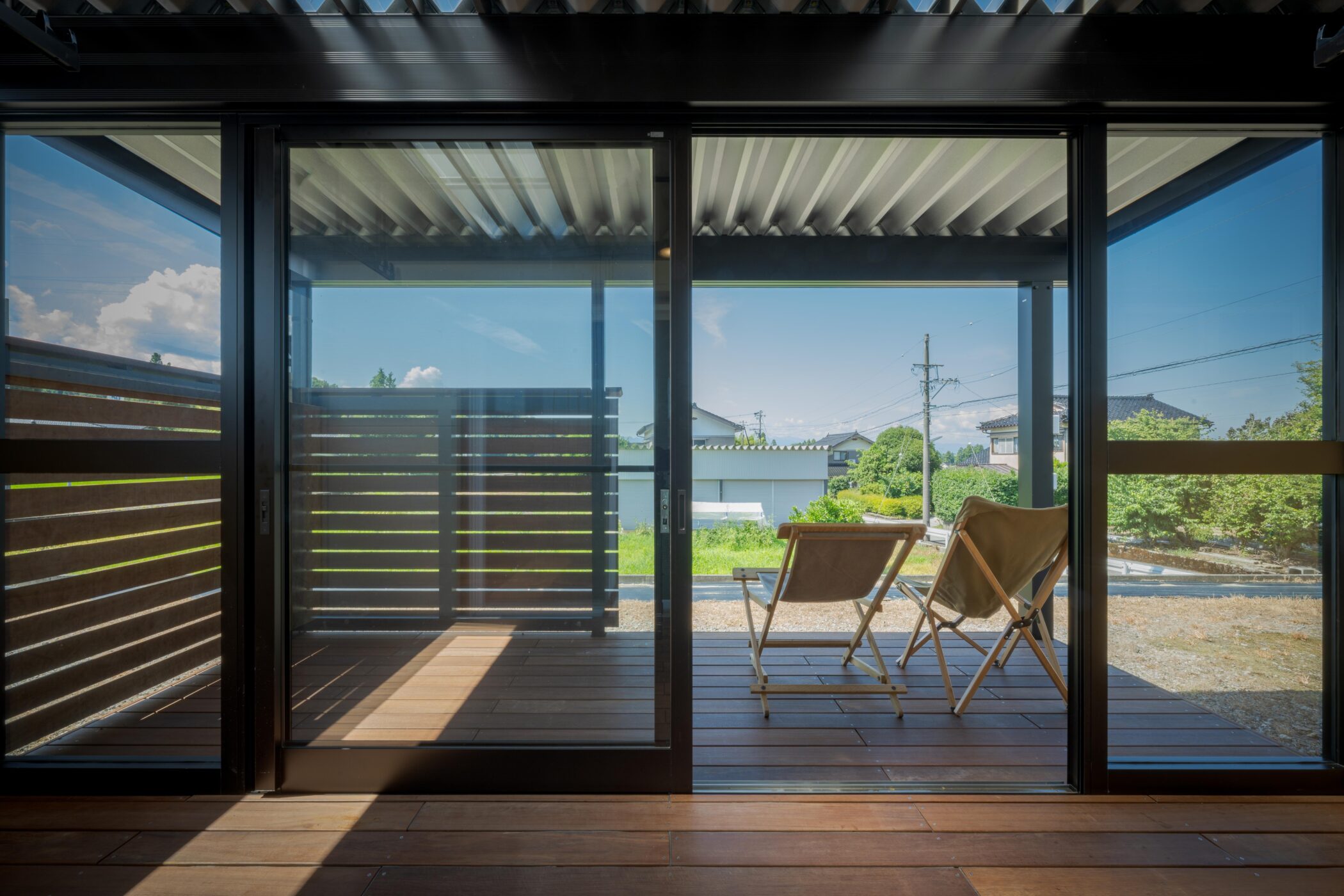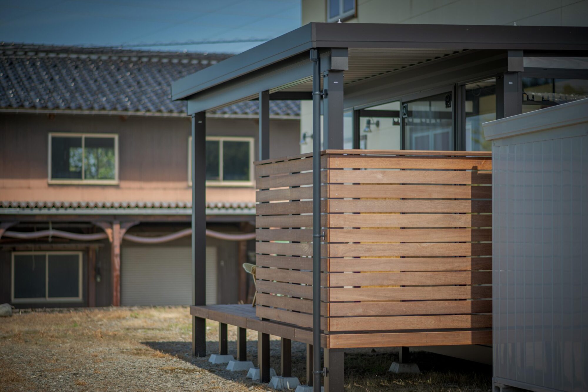 車通りの多い道からガーデンルームを効率的に目隠しする位置に必要最小限配置されたウリン製目隠し。